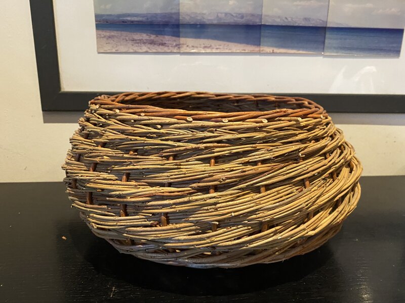 salice alcantara, tecnica cordone; base appoggio diametro 17 cm, diametro max 32 cm, altezza 18 cm, apertura diametro 24 cm.